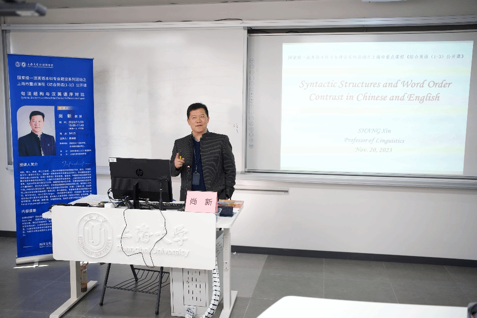 11月20日上午10点,上海市重点课程《综合英语(1-3)》公开课第一讲《句法结构与汉英语序对比》在B415教室开讲,本讲由外国语学院院党委副书记、院长尚新教授主讲,雷远旻老师主持。副院长阚怀未、英语系相关课程老师以及大一全体学生集体听课。