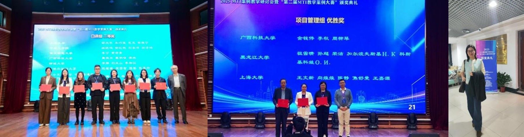 11月1日,由全国翻译专业学位研究生教育指导委员会指导、上海市科技翻译学会主办的“2025 MTI案例教学研讨会暨第二届MTI教学案例大赛颁奖典礼”在上海应用技术大学隆重举行。上海大学外国语学院师生团队凭借扎实的专业素养和创新的教学实践,在本届大赛中斩获多项佳绩,其中,邵庆华、朱巧莲、花亮、曾雅宁师生团队,凭借教学案例《衣·译上海:海派旗袍文化口译教学实践》荣获口译组二等奖;虞怡达、范林姗、李梦岚、刘创、王玮师生团队提交的《MTI选修课“跨文化商务沟通实务”的跨学科增值转向》获得笔译组三等奖;王文新、向维维、陈静、焦舒曼、王嘉源组成的师生团队,以《国际传播能力指向下的优秀法语翻译人才培养》案例荣获项目管理组优胜奖。学院教师代表邵庆华应邀在研讨会上进行分享,围绕学院实施案例教学的宝贵经验与创新方法与全国同行展开深入地交流。