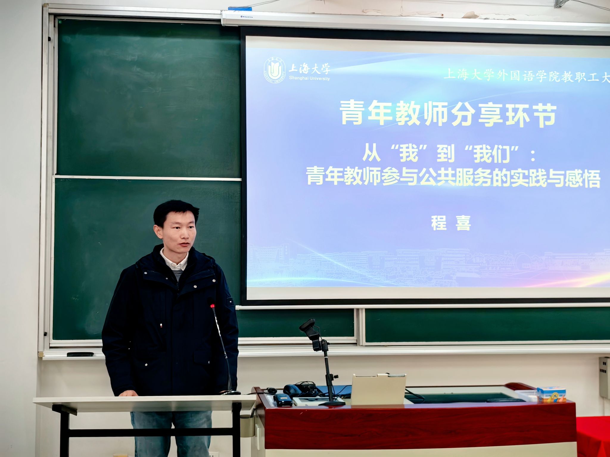 在青年教师分享环节,英语系程喜老师以“从‘我’到‘我们’:青年教师参与公共服务的实践与感悟”为题,结合自身担任系主任助理与党支部书记的双重角色,分享了在参与公共服务过程中获得的视野拓展、能力锻炼与归属感深化。学院竞赛中心主任安宁老师以近期承办大型学科赛事为例,详细复盘了团队在组织协调、应对挑战中的实践与思考,生动展现了“在做事中锻炼成长”的过程。上海大学葡语国家区域研究中心秘书长张梦瑶老师则系统介绍了中心的定位、规划与跨学科合作愿景,并向全院教师发出了共同参与研究平台建设的诚挚邀请。