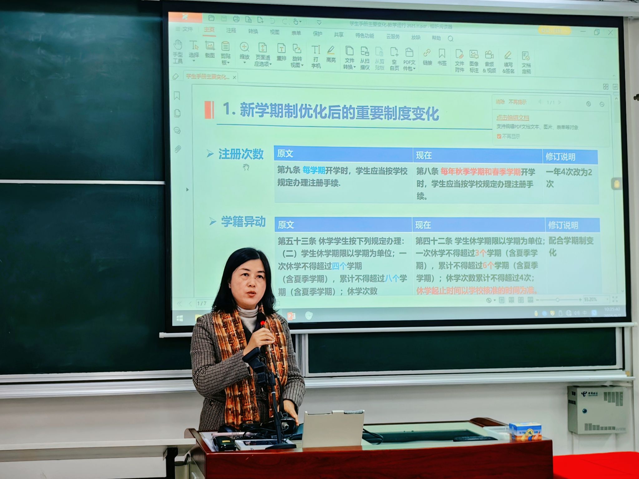 张建琴副院长就学校最新出台的教学管理相关政策进行了传达与解读,重点说明了学期制优化后涉及考试、成绩、学籍管理等环节的调整要点,提醒全体教师关注变化,协同做好教学运行与学生指导工作。