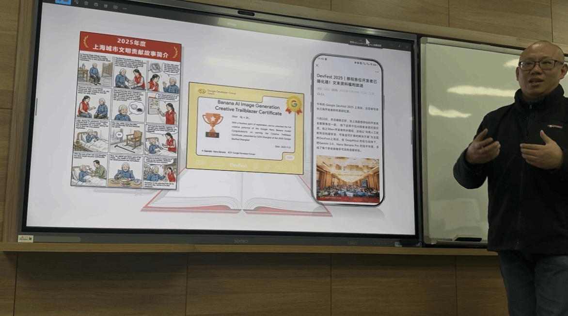 讲座伊始,谢老师与同学们就学习生活中AI的使用进行互动,了解到同学们主要利用AI工具生成图片和视频以及查询资料。随后,谢老师强调,AI时代,英专同学不能仅仅学习语言基本技能,而要结合AI,赋予冰冷的AI以人文的温度。简短互动与导入后,谢老师切入本次讲座主题,他分享了带领上海奉贤区一点公益发展中心“四团阿姨”项目入围上海市20个“城市文明贡献故事”的经历,重点讲解了如何利用最新的AI技术将她们的故事制作成12格英文连环画并在2025年Google全球开发者大会(上海站)活动中获奖。这一案例生动诠释了如何赋予AI人文温度,呈现可亲可爱真实的上海“四团阿姨”形象,在国际舞台上讲好上海故事,传播上海城市精神。最后,谢老师结合最近火爆的“文化出海”现象具体地讲解了AI在文化传播中的运用,强调英语专业学生需发挥对目标文化群体文化深入了解的专业优势对提示词进行修改优化,以达成更易于西方国家接受的国际传播效果,勉励同学们从上海温度的国际传播出发,鼓励大家拓宽视野,积极顺应时代潮流,尝试更多可能。