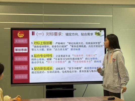 12位团支部书记围绕策划思路、实施过程、特色亮点与育人成效等内容进行了精彩陈述。答辩内容紧扣外语专业特色,涵盖“双语理论宣讲”“跨文化志愿服务”“专业实践赋能”“多语种文化交流”等多元形式,展现了各支部立足语言专业、贴近青年学子、注重实践实效的活动风貌,彰显了外语学子的语言素养与国际视野,更体现出基层团组织的活力与创造力。