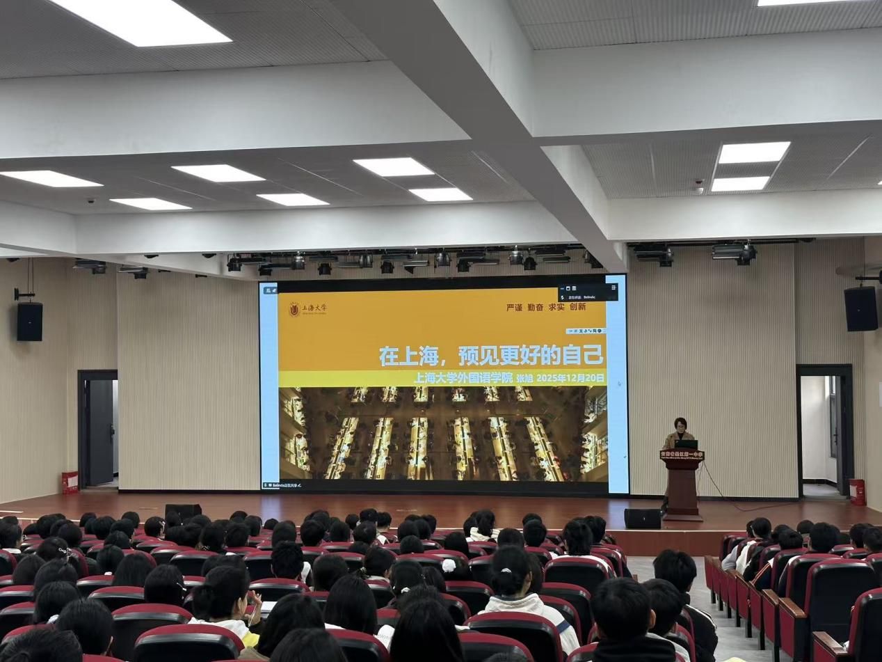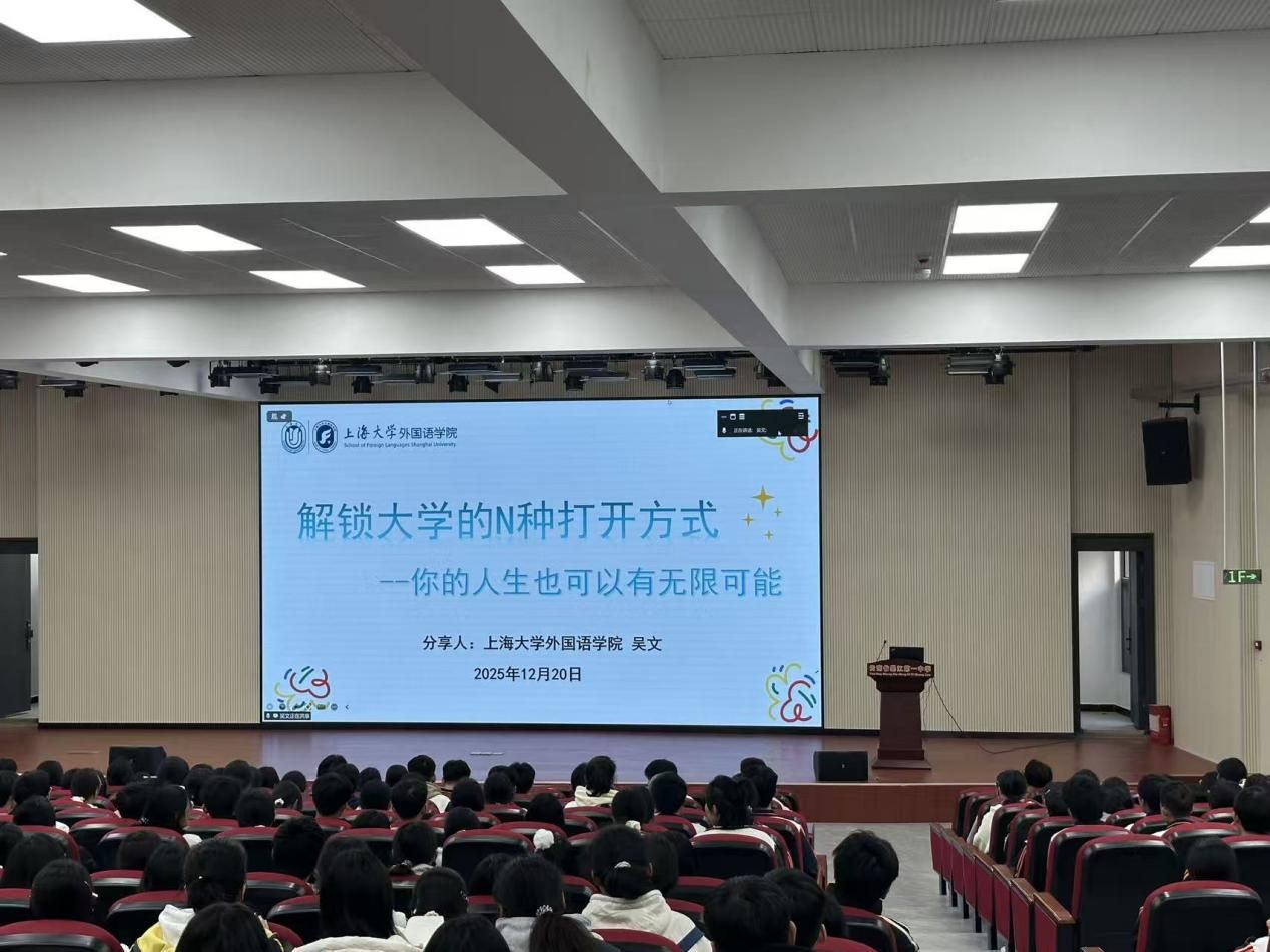 分享会上, 来自上海大学外国语学院的4位研究生结合自身求学与成长经历,依次开展主题分享。2025级外国语言学文学专业吴文以《解锁大学的N种打开方式——你的人生也可以有无限可能》为题,系统梳理大学多元发展路径与成长机遇,为高三学子科学规划升学方向提供了实用思路;2025级外国语言学文学专业张旭围绕《在上海,遇见更好的自己》,分享了在沪求学的鲜活成长感悟,传递出积极进取、向阳而生的青春理念;2025级日语笔译专业张曾玲聚焦《语赴上海,与你看世界》主题,结合日语笔译专业特色,生动阐述了语言学习在拓宽国际视野、搭建跨文化沟通桥梁中的重要意义;2025级外国语言学文学专业张磊则以《青春里的“阿甘式”生长——把平凡种成奇迹》为题,巧用电影《阿甘正传》的经典隐喻,鼓励高三学子以坚持为翼、以努力为基,在高考最后的169天里奋力拼搏、逐梦前行。