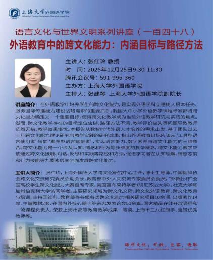 12月25日上午,上海大学外国语学院“语言文化与世界文明系列讲座”第一百四十八期成功在线上举办。本次讲座特邀上海外国语大学张红玲教授作题为“外语教育中的跨文化能力:内涵目标与路径方法”的专题分享,吸引了八十余名师生云端参与。讲座由上海大学外国语学院副院长张建琴副教授主持。