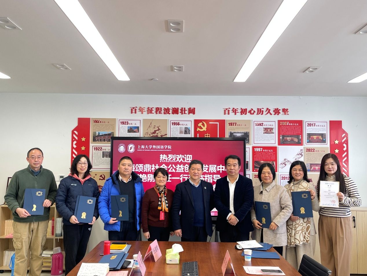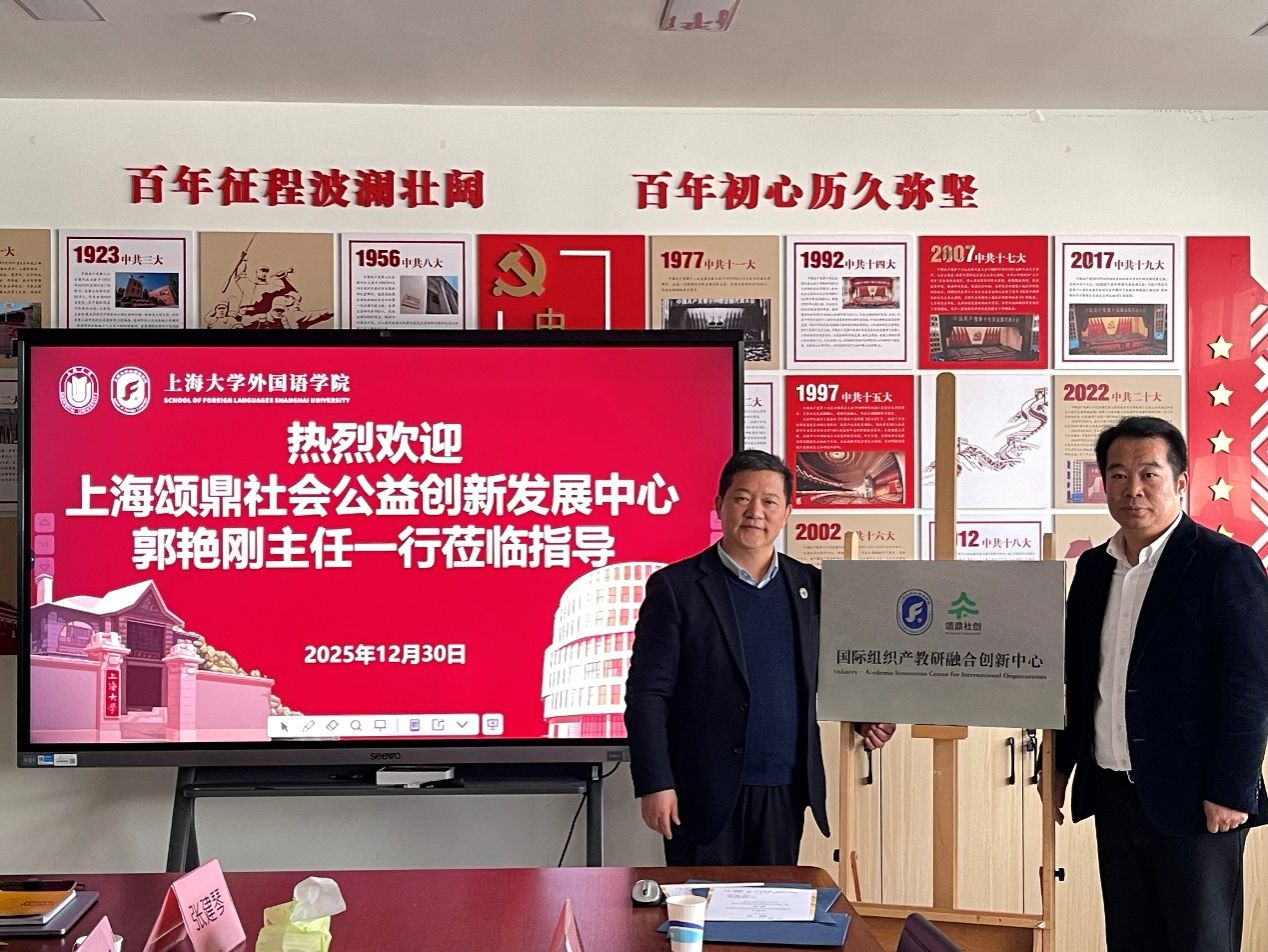 12月30日,上海颂鼎社会公益创新发展中心(以下简称“颂鼎社创”)主任郭艳刚、理事黄凌、党支部书记海伦、项目总监闫贝贝一行四人到访上海大学外国语学院,双方围绕产教融合、科教融汇路径,以及提升学生创新实践能力等核心议题展开深度交流。上海大学外国语学院党委书记吴蔚,党委副书记、院长尚新,副院长唐青叶、戴朝晖、张建琴,英语系副主任张珊珊和雷远旻老师等共同参与座谈,座谈会由唐青叶副院长主持。