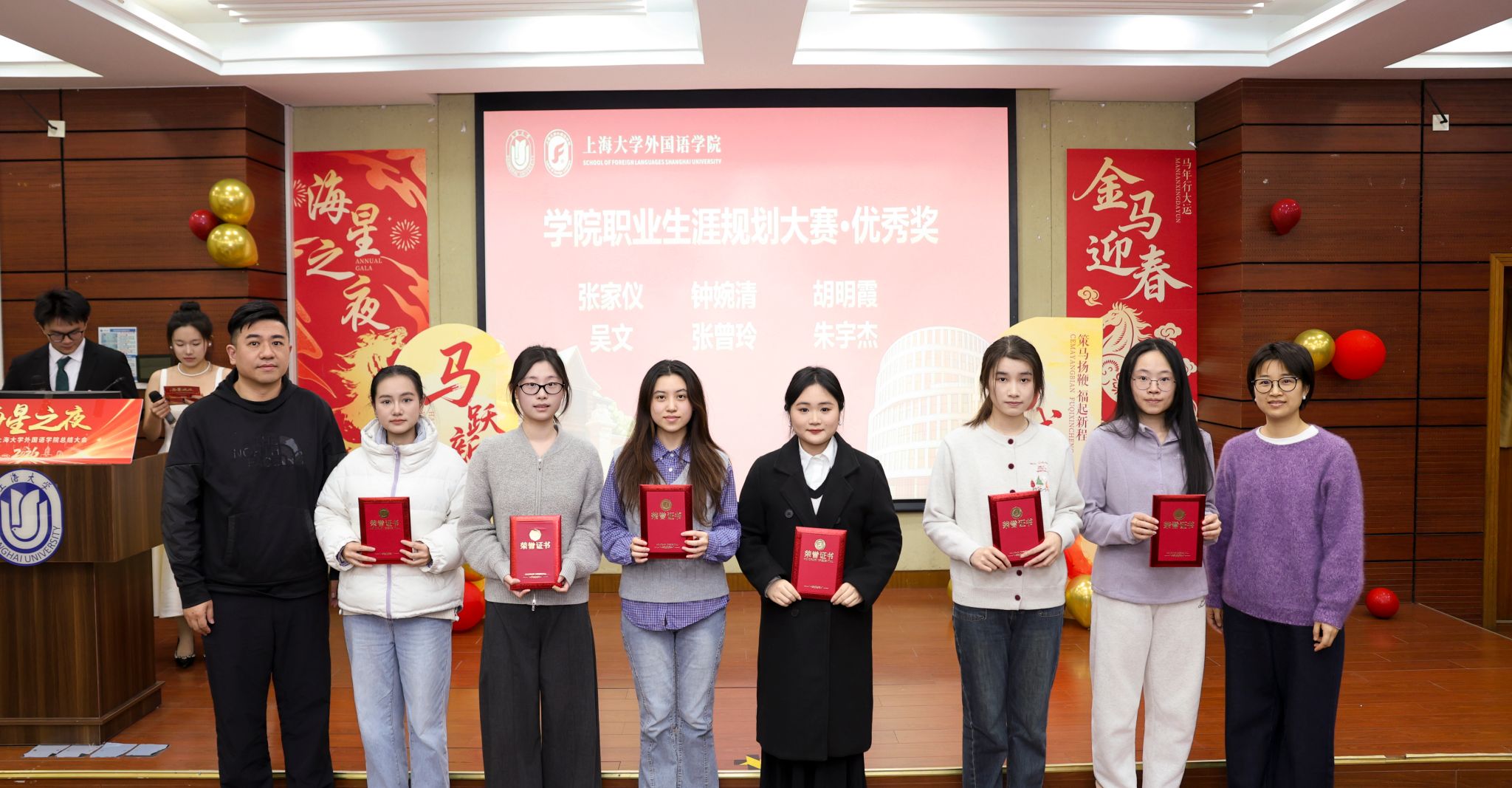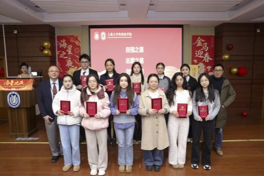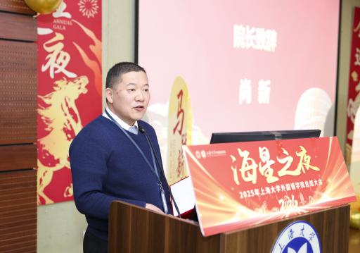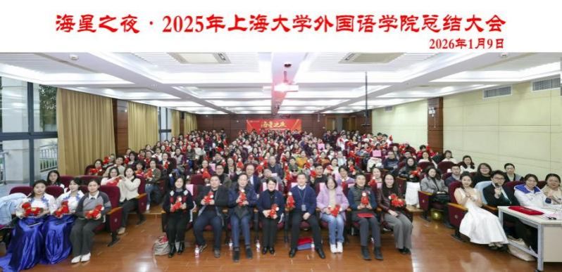 岁序更替,华章日新。踵事增华,踔厉奋发。2026年1月9日下午,上海大学外国语学院在宝山校区东区蔡冠深讲堂隆重举行2025年度“海星之夜”总结大会。外国语学院老领导谢之君、周平,学院党委书记吴蔚,党委副书记、院长尚新,党委副书记、副院长贾小琴,副院长戴朝晖、张建琴,上海久柏易游信息科技有限公司(900游平台)创始人、学院校友会副会长高宏久,北京华夏润唐文化传媒有限公司总裁金志宏,上海国际工程咨询有限公司董事长刘千诚,蜂须贺(上海)事务所所长吴俊,上海理工大学国别区域研究所所长刘略昌,绮丽少女(上海)商业经营管理有限公司创始人张华,汇丰银行北京分行、环球支付方案部高级副总监陈盼蕊等校友,学院各系部主任、学院教职工和学生代表齐聚一堂,共赴盛会。本次大会由学院本科生邓修杰、何思敏主持。