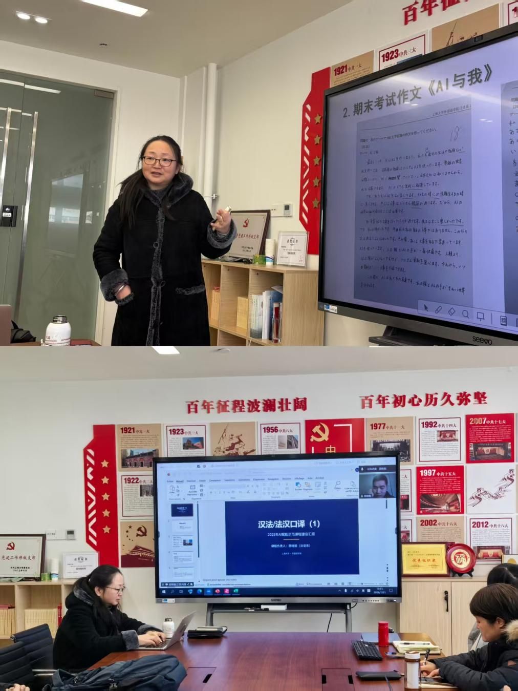 顾晓毅老师接着进行了2025年AI赋能示范课程建设汇报,详细介绍《汉法/法汉口译(1)》课程的立项和课程建设情况,展示AI技术在该课程教学中的具体应用。苏鹰老师分享了市级重点项目《数智赋能的日语素养基础》的建设经验,介绍如何将技术平台、语料库融入备课、教学和测评等环节,实施多元化教学与评价。
