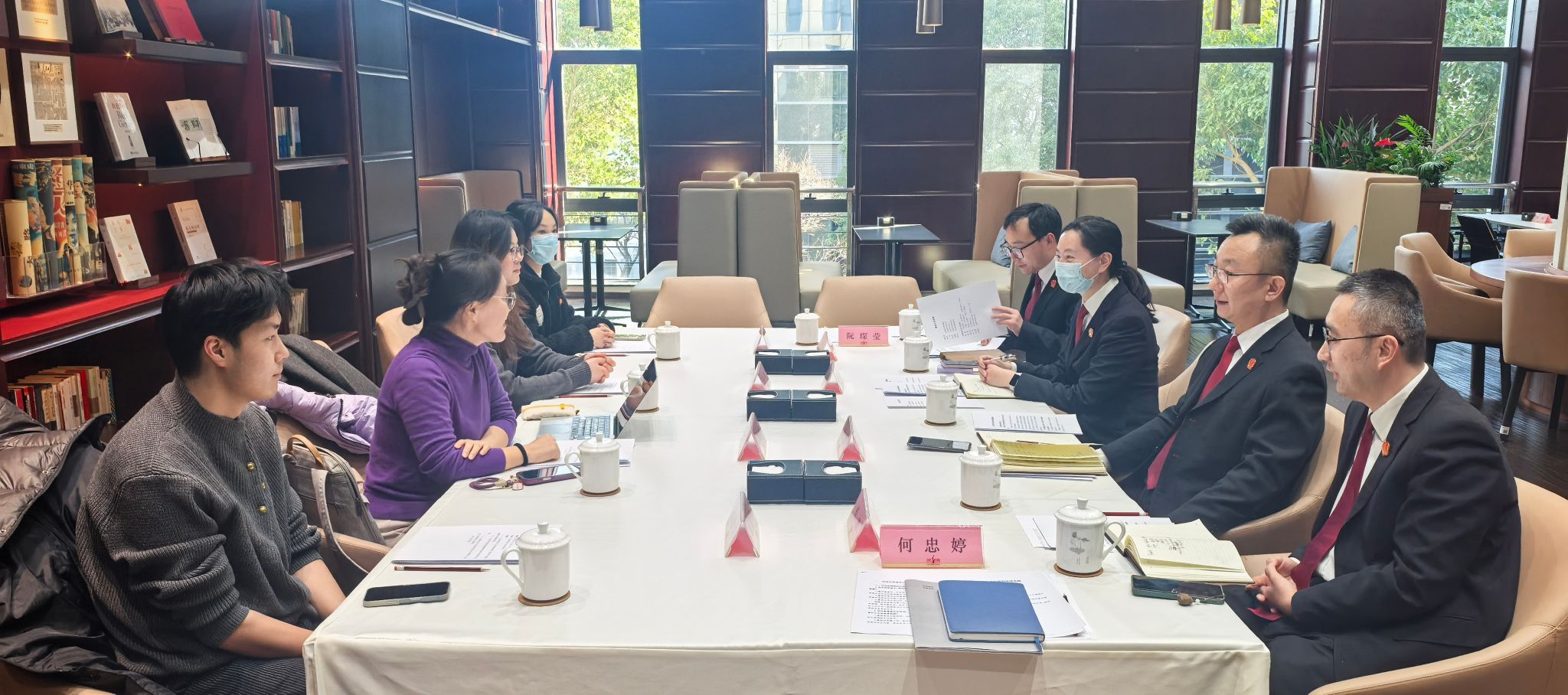 座谈伊始,谢主任对徐汇法院基本情况作了简单介绍。作为位于中心城区的基层法院,徐汇法院依托区位优势,承担着较为突出的司法使命,涉外法治案件相对集中,涉及数字经济、人工智能等新兴产业的案件数量近年来持续增长。在此基础上,谢主任重点介绍了以“甘棠文化”为核心的法院文化建设及其所体现的现代司法理念,围绕司法为民目标,逐步形成了一系列具有特色的工作机制。相关举措包括设立“甘棠树下”社区法官工作室,推动司法服务向基层延伸;创新家事审判方式,回应家庭纠纷多元化需求;加强知识产权审判,服务区域创新发展;引入第三方调解组织,提升矛盾纠纷化解效率;以及推进数字智慧法院建设,不断提升司法运行的智能化、信息化水平。通过上述介绍,全面展现了徐汇区人民法院在服务区域发展、回应社会关切和推进司法现代化方面的探索与实践。