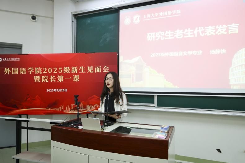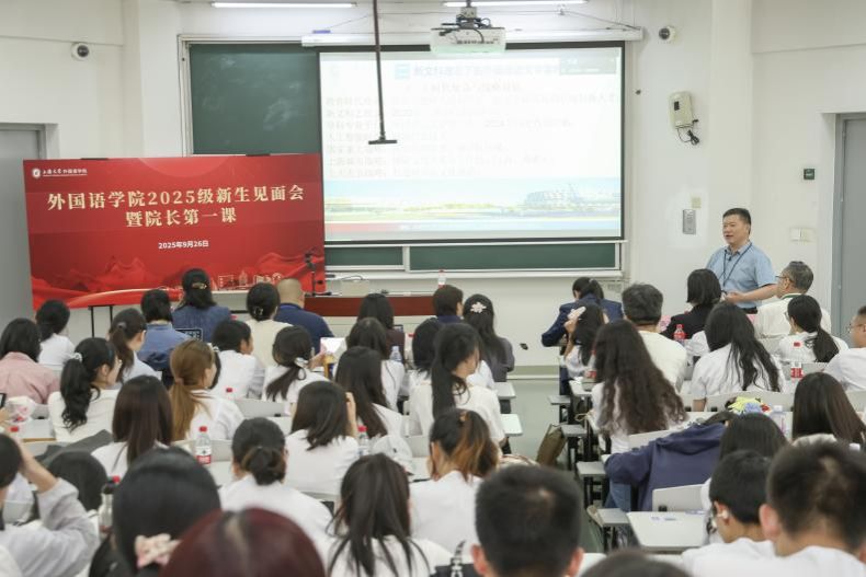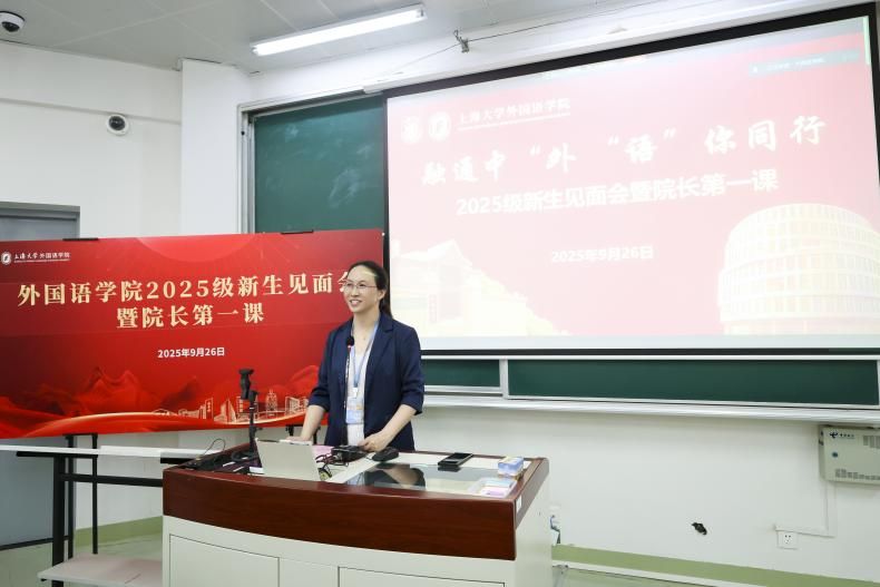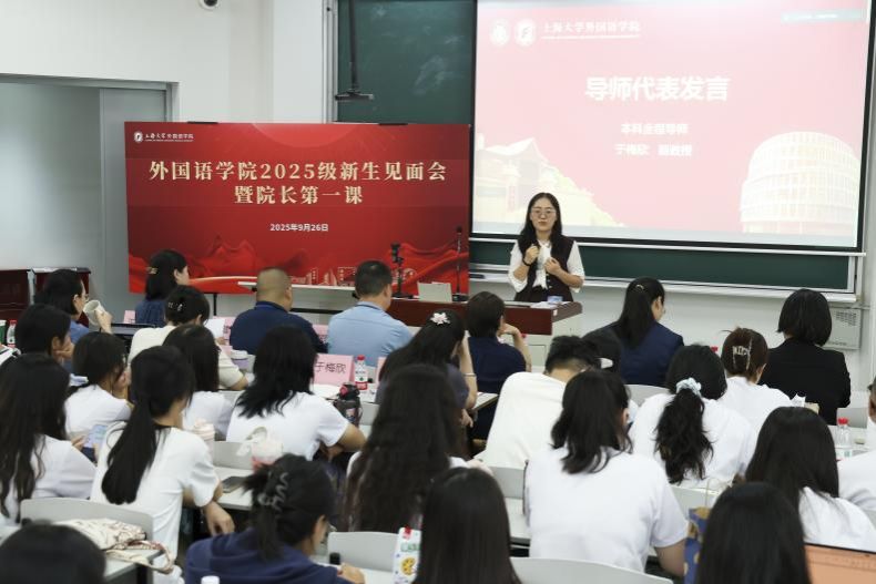 9月26日下午,外国语学院2025级新生见面会暨院长第一课在宝山校区BJ207教室隆重举行。学院党委书记吴蔚,党委副书记、院长尚新,党委副书记、副院长贾小琴,副院长戴朝晖、唐青叶、张建琴,英语系主任马拯,日语系主任赵莹波、副主任苏鹰,法语系主任王文新、副主任向维维,大学外语部主任李晓媛、副主任于梅欣,学院团委书记马思涵,研究生辅导员曹若兰及2025级全体新生出席了本次活动。本次新生见面会由外国语学院党委副书记、副院长贾小琴主持。