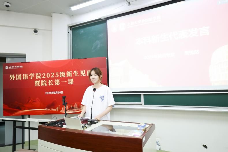 老生代表分享环节,2023级外国语言文学专业的汤静怡同学向新生们介绍了上海大学、外国语学院丰富的资源,结合进博会、莎士比亚戏剧节、湖畔沙龙等学习、实践经历,分享“走出舒适区”的成长体会。她建议新生保持清晰的自我认知,以自身的稳定性应对外界的不确定性,凭借稳定的内核探索未知,书写属于自己的青春答卷。